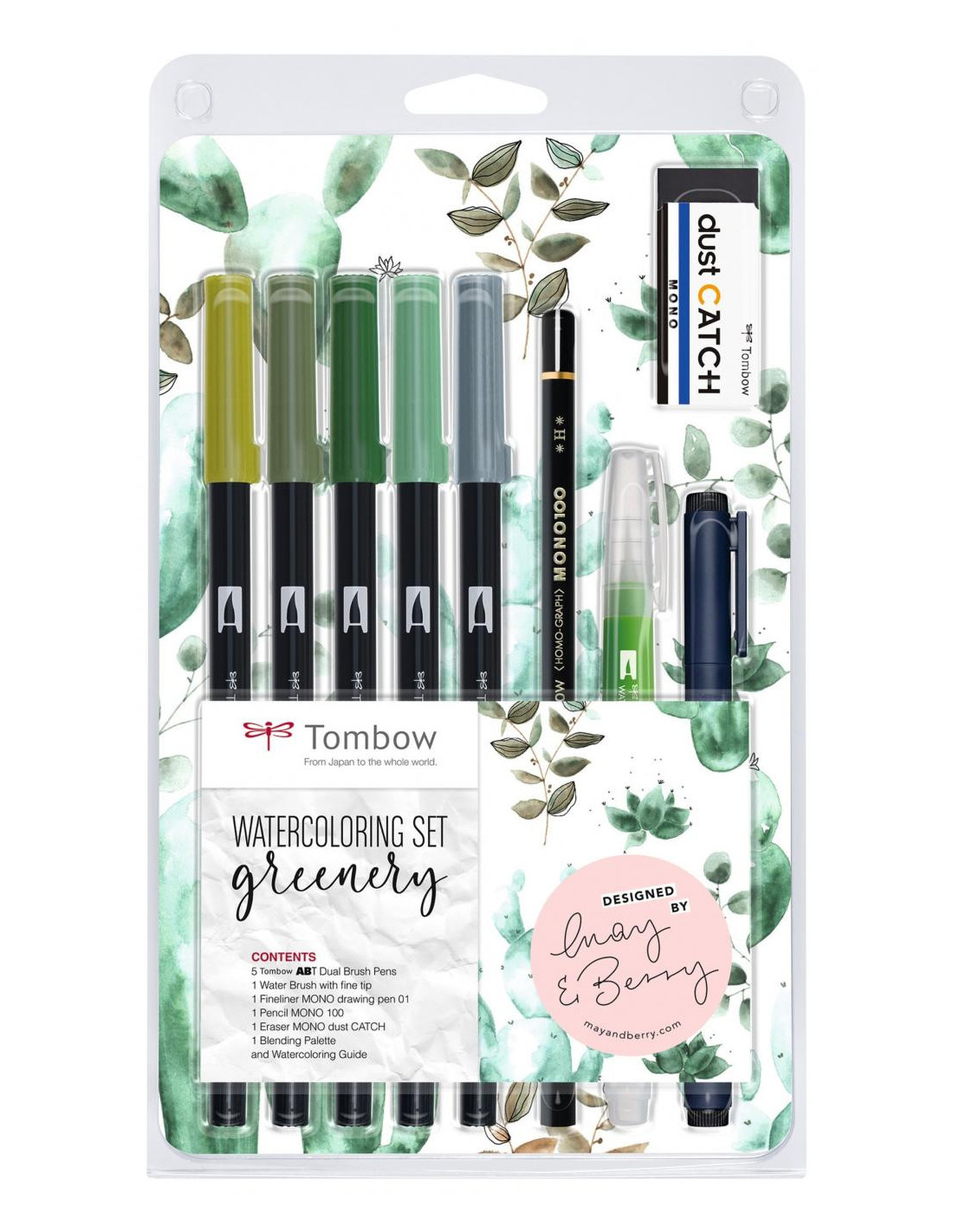 Sættet indeholder det nødvendige materiale til at lave akvarel malerier/tegninger. Sættet indeholder instruktioner med tips og tricks til at skabe et grønt maleri. Sæt og instruktioner sammensat og designet af May & Berry. Produkter: ABT Dual Brush Pen med en fin tip til at skabe præcise linjer og en bred børste tip til bred farve applikation. Farverne kan blandes sammen og overmales med vand. Genopfyldelig blending pen (tom) til maling med ABT Dual Brush pennens vandbaserede maling. Fineliner MONO drawing pen til tegning af præcise linjer og konturer. MONO 100 blyant til sletbare linjer. Viskelæder MONO dust Catch til ren og præcis sletning af linjer. Palette til blanding og opsamling af den vandbaserede overskudsfarve.