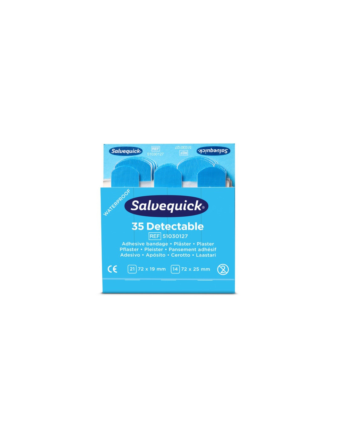 Plastrene kan spores af de fleste metaldetektorer, som normalt anvendes her og den blå farve gør dem lette at se, Plastrene er allergitestede, lette at anvende og praktiske at bruge. INDHOLD: Hver refill indeholder 35 plastre (21 stk, der måler 72 x 19 mm, og 14 stk, der måler 72 x 25 mm).