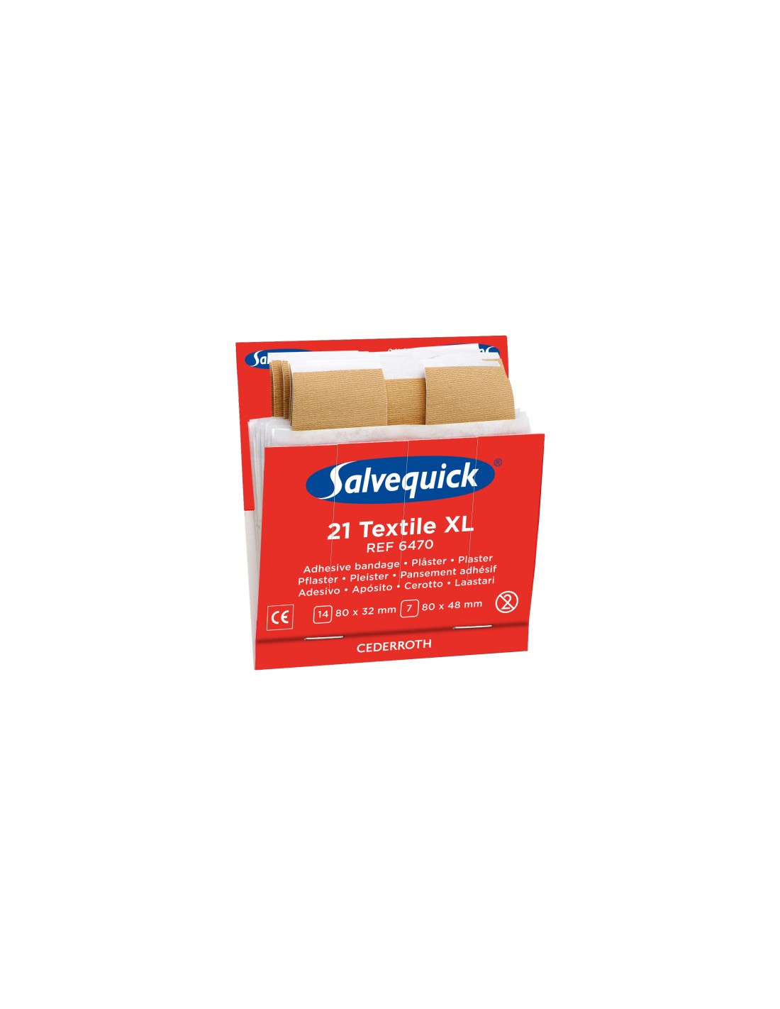 Indhold: 21 plastre (14 stk. 80x32 mm og 7 stk. 80x48 mm). 6 refiller/æske. Salvequick ekstra stort tekstilplaster er ordentlige, lidt større plastre af høj kvalitet. De er allergitestede, lette at sætte på og fleksible og smidige at bruge