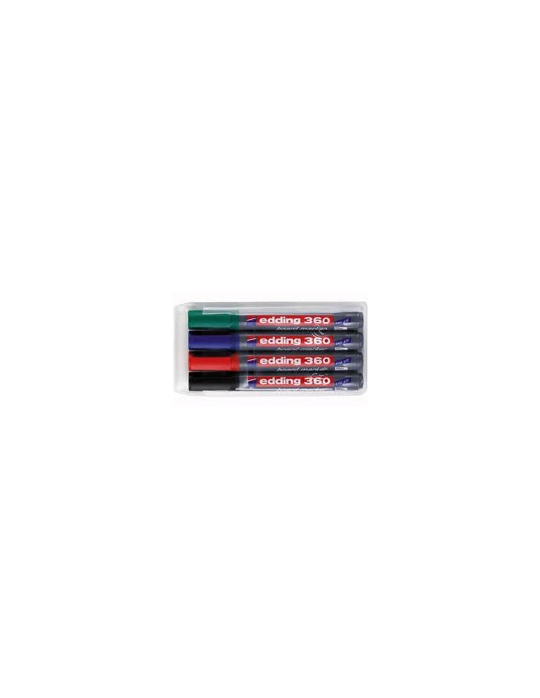 Whiteboard marker sæt med 4 penne i farverne: Sort, rød, blå og grønWhiteboard marker med rund spids.Hurtigtørrende pigmentblækMed "cap off" blæk, hvilket betyder at whiteboard markeren kan ligge i kortere tid uden hætte og alligevel være skriveklar.Plastikhylster Skrivebredde 1,5 - 5mmPakken indeholder 10 x 4-etuiVarenummer: 360-4