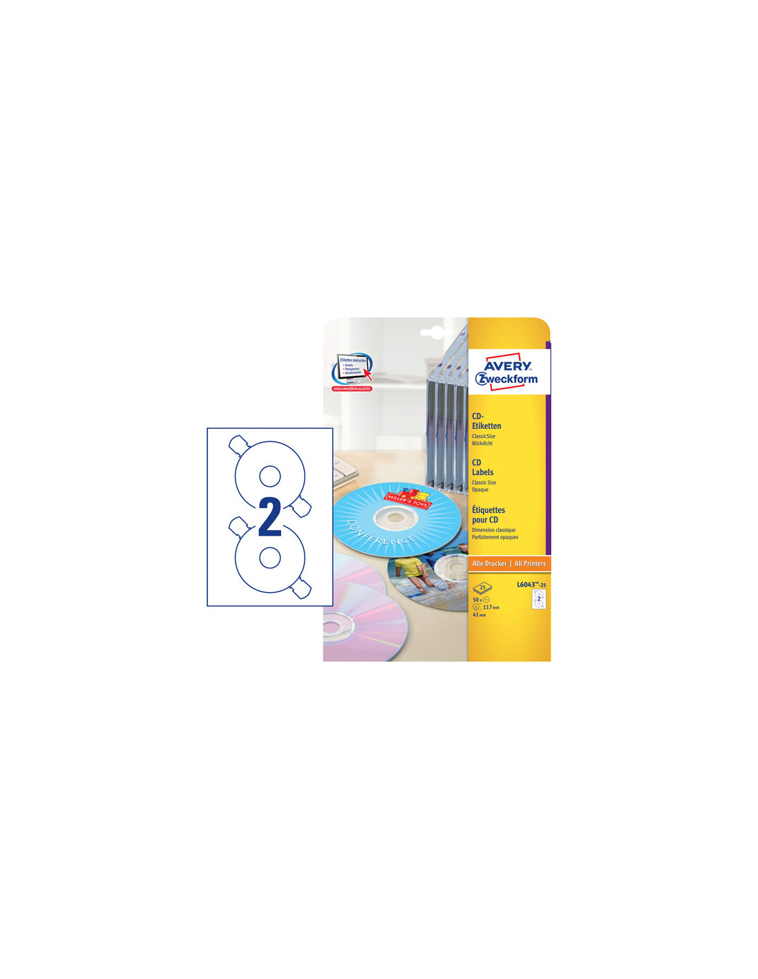 Avery Varenummer L6043-25Avery's CD etiketter giver dine brændte CD´er et professionelt udseende og giver dig et hurtigt overblik over data, billeder, musik osv. Full Face etiketterne dækker helt ind til hullet på CD skiven, og giver dermed mere plads til tekst og billeder, mens Classic Size CD etiketterne giver dine CD´er et mere klassisk udseende. Matchende CD omslag kan let designes og printes særskilt.
