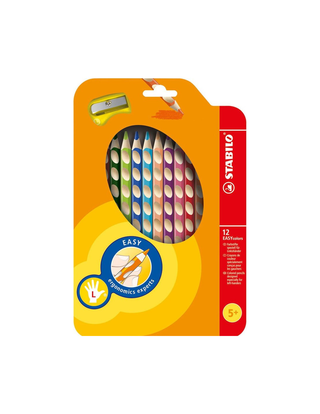 Den første ergonomiske farveblyant specielt for venstre-og højre hånd. En del af STABILO EASYergonomics produktlinje. Trekantet design og unikke skridsikre greb sikrer en afslappet hånd holdning. Selv under spidsning, betyder det forskudte greb zone, at børnene vil blive hjulpet til at holde blyanten på den rigtige måde lige indtil det tidspunkt, hvor blyanten er færdigspidset. Gul eller rød farve kodning i endenaf blyanten viser venstre-og højrehåndede versioner. 12 strålende lyse farver og lavet af træ fra ansvarligt drevne skove. Hver blyant har et navneskilt. Sættet indeholder 12 forskellige farver