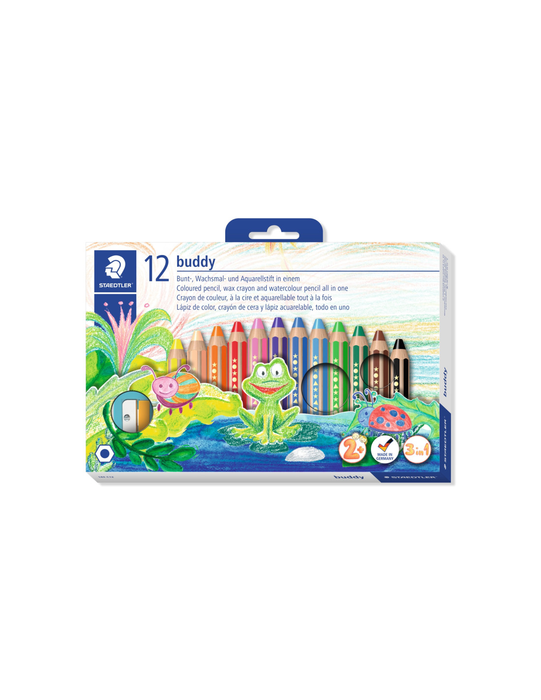 Buddy farveblyanten har et attraktivt stjernedesign og formen er designet specielt til små børnehænder og til ikke at trille ned af bordet. Buddy kan bruges på papir, pap, glas og mørke overflader, og den er ideel til de første skrive og tegne oplevelser. Farveblyanten har en forstærket blyantsmine. Den er fremstillet af PEFC certificeret træ. Leveres i papetui med 12 stk. i assorterede farver samt 1 stk sikker blyantspidser. Til børn fra 2 år.