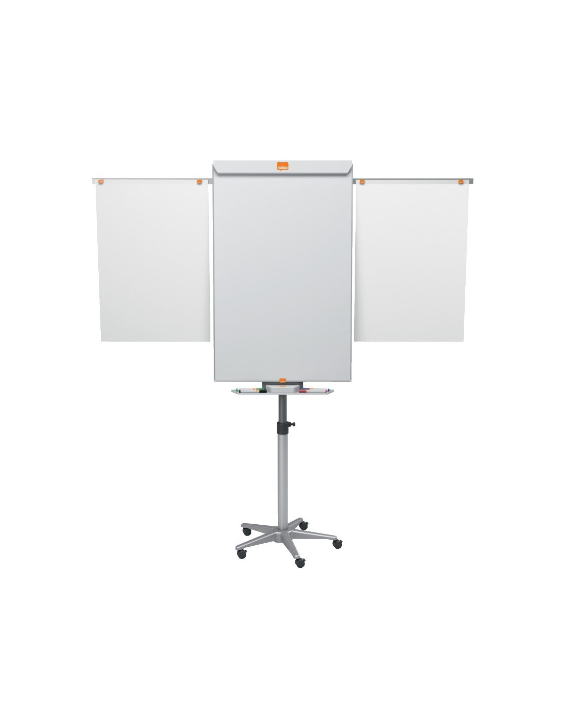 Mobil flipover Classic Nano Clean med smal, elegant ramme, der maksimerer pladsen på tavlen. Den rummelige pennebakke sidder under tavlen uden at gå indover overfladen. Højdejusterbar mobil base med låsbare hjul gør det nemt at flytte flipoveren rundt i mødelokalet. Med udtrækbare, magnetiske arme, der let trækkes ud, når flere flipoverpapirer skal vises. Magnetisk stål whiteboardtavle med Nano Clean overfladeteknologi giver øget sletbarhed.Kroge er medleveret til at hænge en Nobo flipoverblok på. Med en riv væk bjælke, som gør det let at fjerne papirer efter brug Leveret med en Nobo dry wipe marker 15 års garanti på Nano Clean overfladen