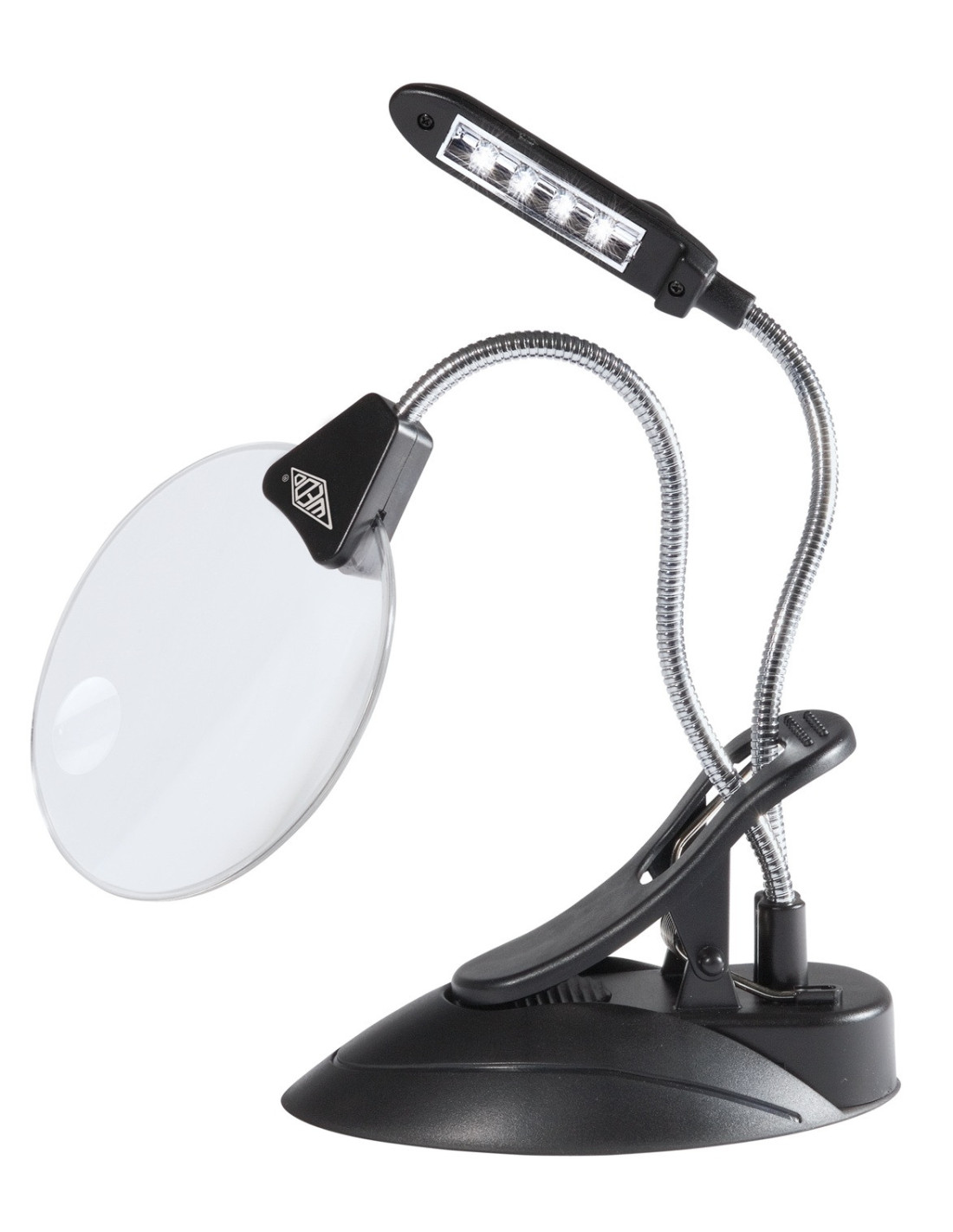 Praktisk Lup med LED lys. Holderen kan stå på bordet eller klemmes fast om bordkanten. Luppen er 10,2cm i diameter og linsen er med integreret lille linse. Forstørrer 2 gange og den lille linse forstørrer 2 gange. Leveres i gaveæske inklusiv 2 AAA batterier. Sort.