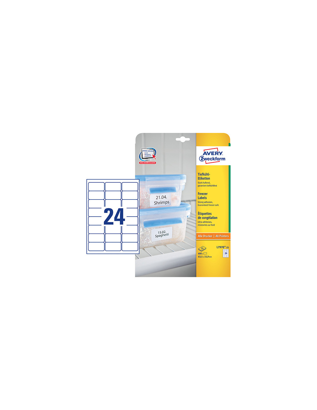 Dybfrost-etiketterGaranteret frostbestandige Kuldebestandigt papir, stærk klæbeevne - selv på overflader med let rimfrost Etiketlimen tåler endda direkte kontakt md tørre, ikke-fedtholdige levnedsmidler Laveste påføringstemperatur -20°C, Brugstemperatur -50°C - +70°C Til anvendelse i frysere, kølerum og lign. Til laser, farvelaser og inkjet Etiket størrelse 63,5 x 33,9 mm