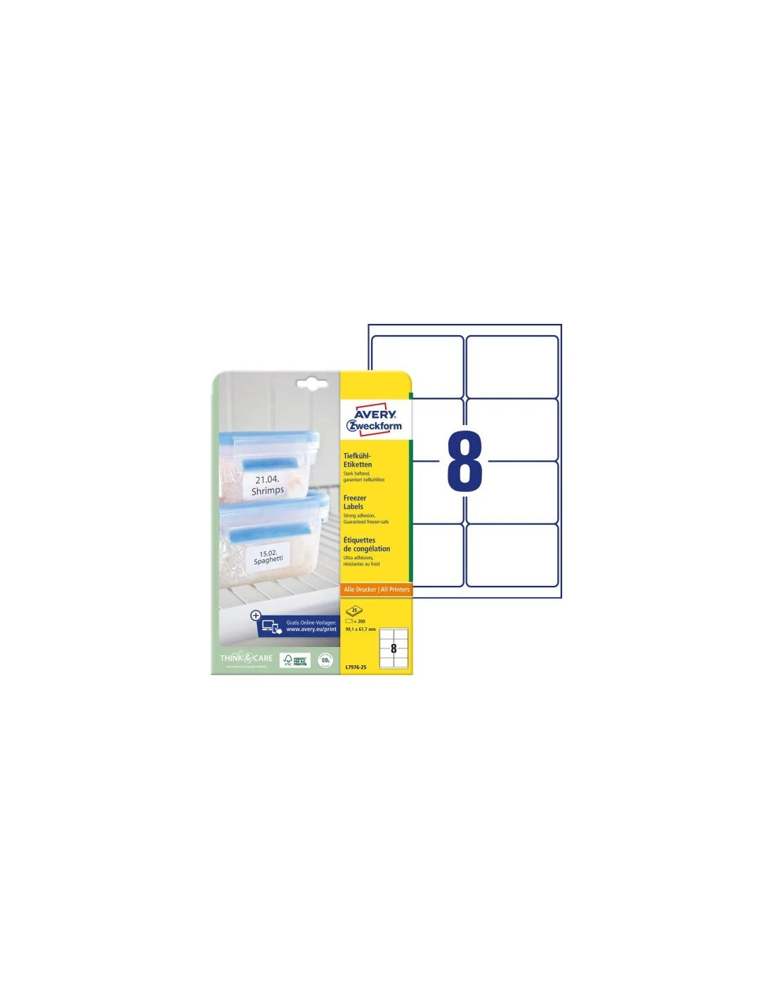 Avery's L7976-25 dybfrostetiketter har 8 etiketter/ark og 200 etiketter/pk, hvor hver etiket måler 99,1 x 67,7 mm. Etiketternes størrelse er velegnet til mellemstore og store emballager, fødevarer mv.