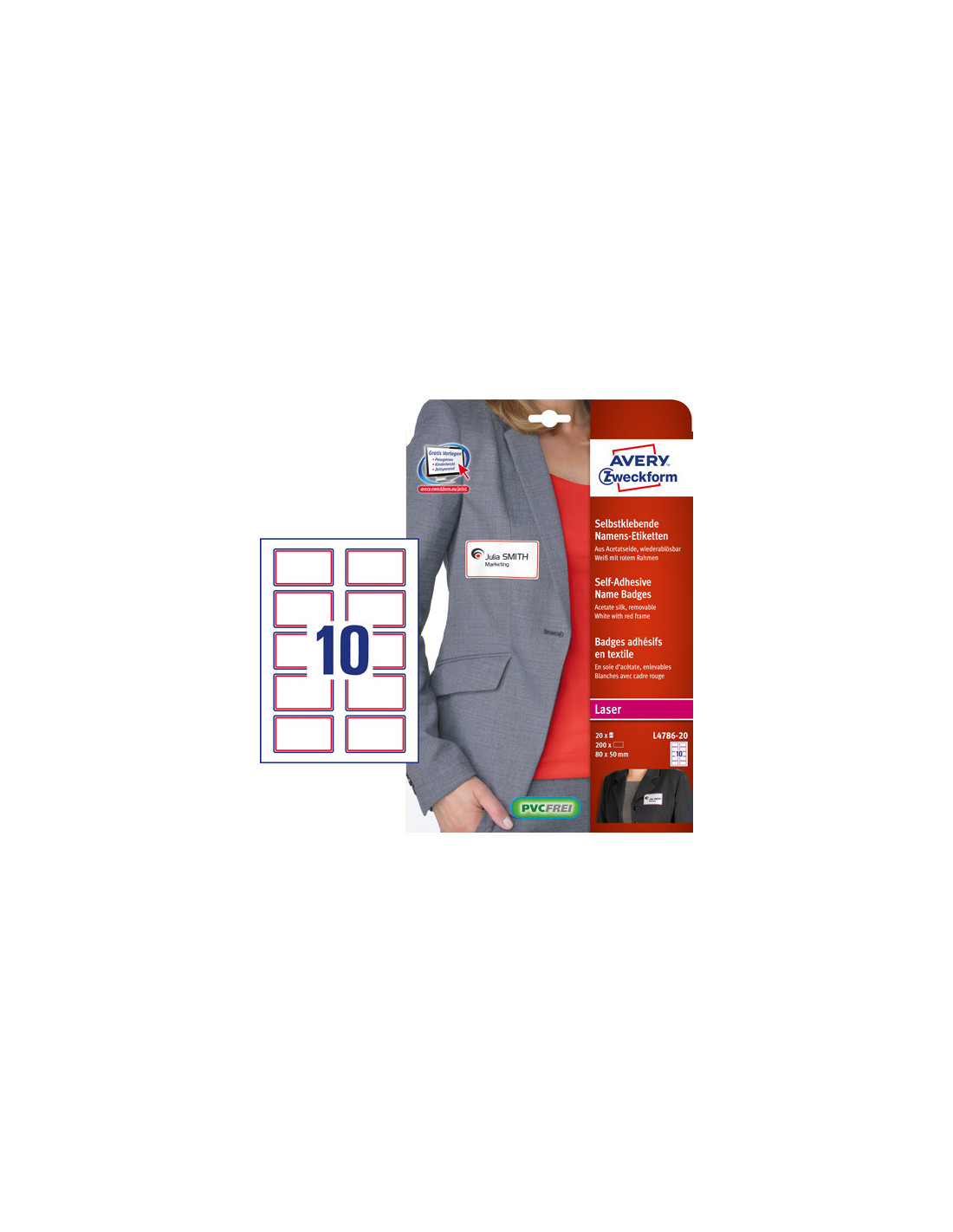 Avery Varenummer L4786-20Avery's navne etiketter er ideelle til seminarer, messer og virksomhedsbesøg og klæber på alle tekstiler. Må dog ikke påklæbes læder, nylon og fløjl, da det kan efterlade mærker