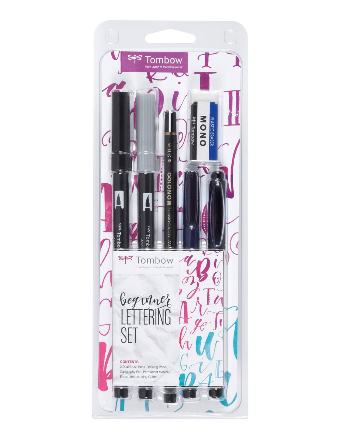 Indhold: 2 ABT Dual Brush Pens med fleksibel pensel tip og fin tip. Farver: sort (ABT,N15) and cool grey (ABT,N75). En tegneblyant MONO 100, 3H (MONO,100,3H). Calligraphy pen Fudenosukemed hård pensel tip, sort (WS,BH). En sort permanent marker MONO twin med to spidser (OS,TME33). Et viskelæder MONO XS (PE,01A).