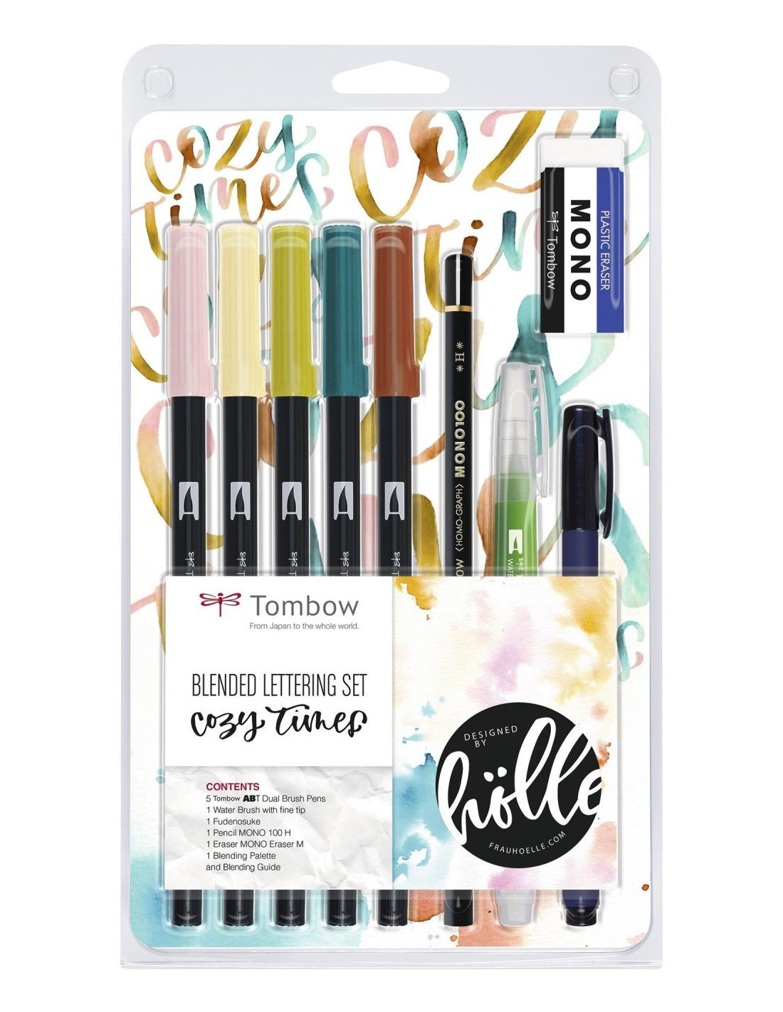 En tysk illustratør, og kombinerer alt, hvad der er behov for til Handlettering i harmoniske farvekombinationer. Produkter i sættet: - ABT Dual Brush Pen med et fint penselspids til nøjagtige fine linjer og en bred pensel til stører flader. Farverne kan blandes sammen og males med vand. - Genopfyldelig vandpensel (tom) til maling med de vandbaserede ABT Dual Brush penne. - Kalligrafipen Fudenosuke med en fin penselspids. Hård spids. - Stabil blyant MONO 100H. - Viskelæder MONO M for præcis sletning af blyants konturer og linier. - Blandepalet til blanding og opsamling af de vandbaserede rester fra ABT Dual Brush pennene. "Blending" er et populært trend emne blandt entusiastiske fans af Handlettering. Frau Hölle har af Tombow produkter sammensat et sæt af høj kvalitet til dette formål. Matchet farverne og designet illustrationerne. I den medfølgende instruktion giver hun tip og tricks til blen