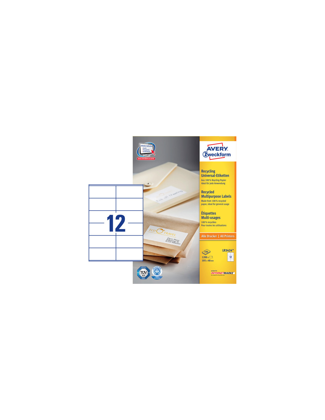Avery Varenummer LR3424Adresse etiketterne er velegnede til breve, pakker og rør i alle størrelser. Etiketterne er fremstillet af genbrugspapir og pakket i genbrugskarton, hvilket betyder at der ikke foretages skovrydning, samt at der er et mindre spild af energi og vand i produktionsprocessen. Genbrugsetiketterne er således med til at beskytte miljøt og klimaet. De indeholder en vandbaseret miljøvenlig lim og er klorfri (PCF), men har en naturlig hvid overflade. "Guaranteed Jam Free" betyder at etiketterne er gennemtestet og garanterer at der ikke sker printstop og forsinkelser i alle typer af printere.