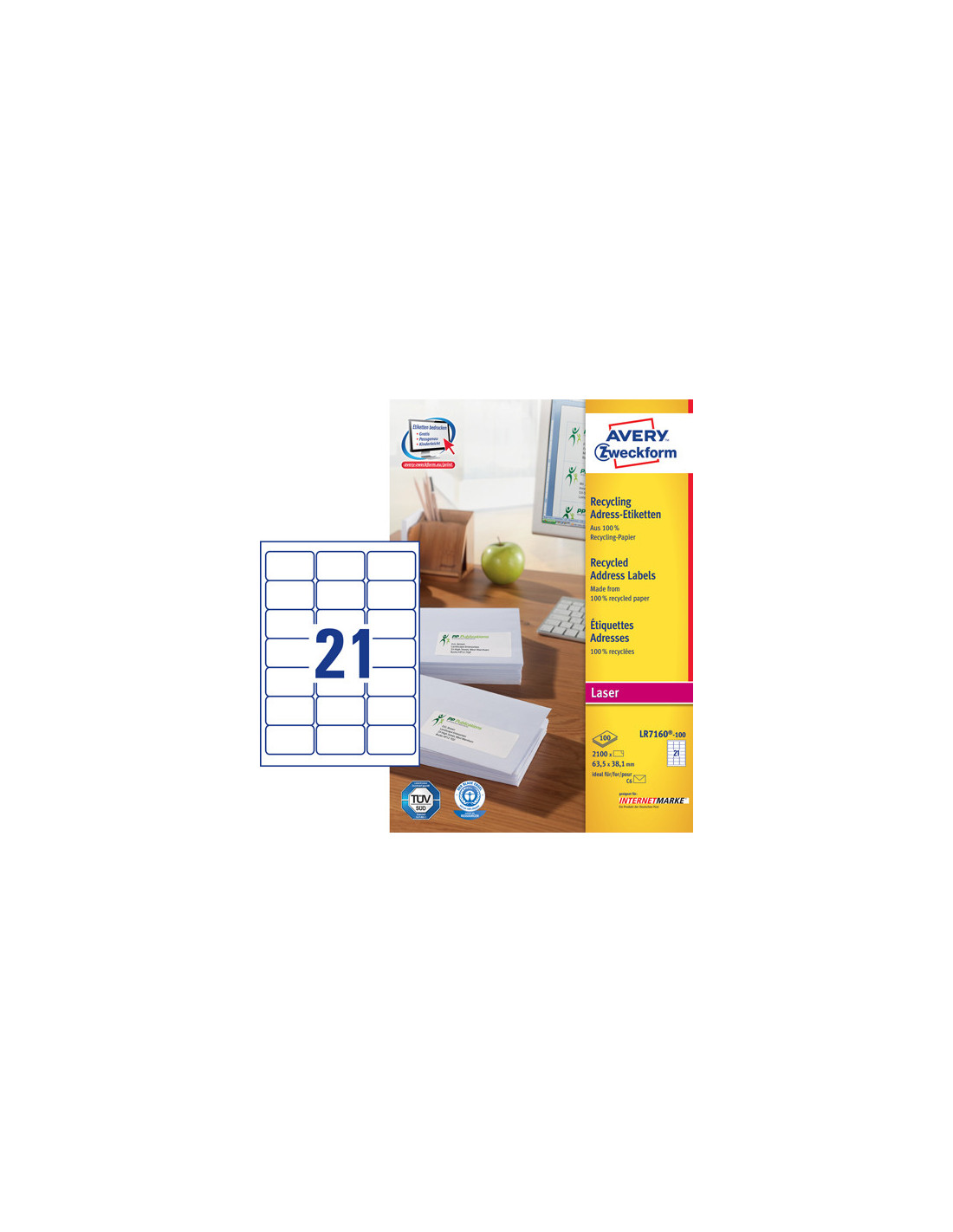 Avery Varenummer LR7160-100Adresse etiketterne er velegnede til breve, pakker og rør i alle størrelser. Etiketterne er fremstillet af genbrugspapir og pakket i genbrugskarton, hvilket betyder at der ikke foretages skovrydning, samt at der er et mindre spild af energi og vand i produktionsprocessen. Genbrugsetiketterne er således med til at beskytte miljøt og klimaet. De indeholder en vandbaseret miljøvenlig lim og er klorfri (PCF), men har en naturlig hvid overflade. "Guaranteed Jam Free" betyder at etiketterne er gennemtestet og garanterer at der ikke sker printstop og forsinkelser i alle typer af printere.