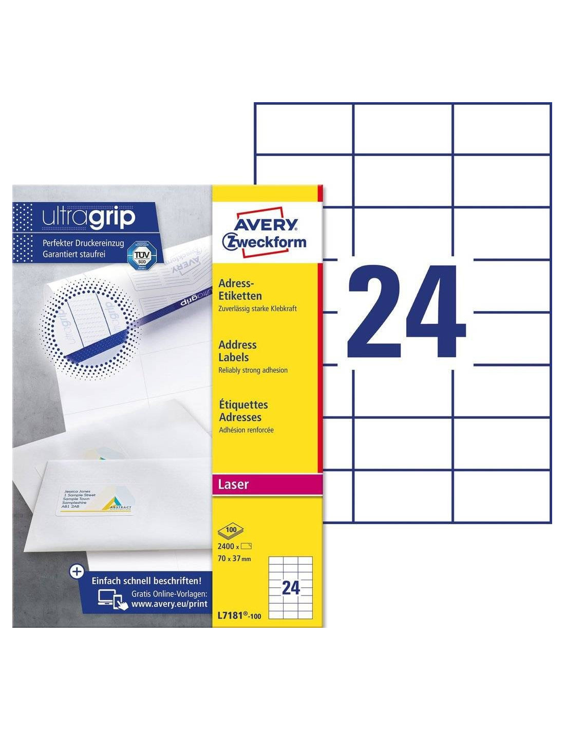 Etiketterne er velegnede som adresselabel til breve, pakker og forsendelses rør i alle størrelser. Avery hvide L7181-100 etiketter med Ultragrip med 24 etiketter pr. ark og 2.400 etiketter pr. pakke er det ideelle valg for dem der udsender store mængder af post. Denne pakke med 100 ark er perfekt til store etiketopgaver.