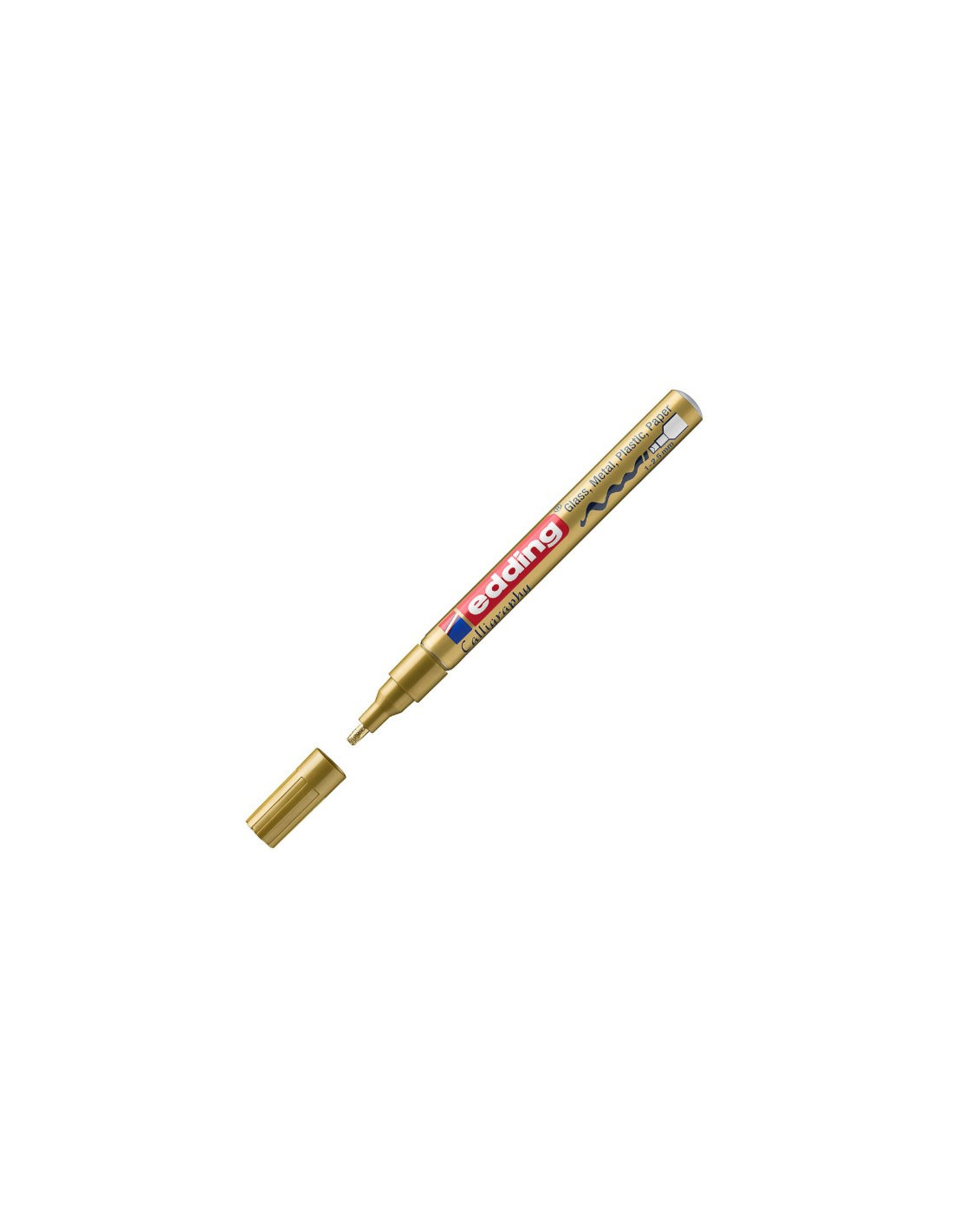 Farve: guldPaint marker med skrå calligraphy spidsPermanent pigmentblæk.Opaque (dækkende)Velegnet til så godt som alle overflader så som: glas, plastik, træ, metal, papir og karton.Også specielt velegnet på mørke og transparente overflader.Aluminiums beholderSkrivebredde 1-2,5 mmPakken indeholder 10 markereVarenummer: 753-53