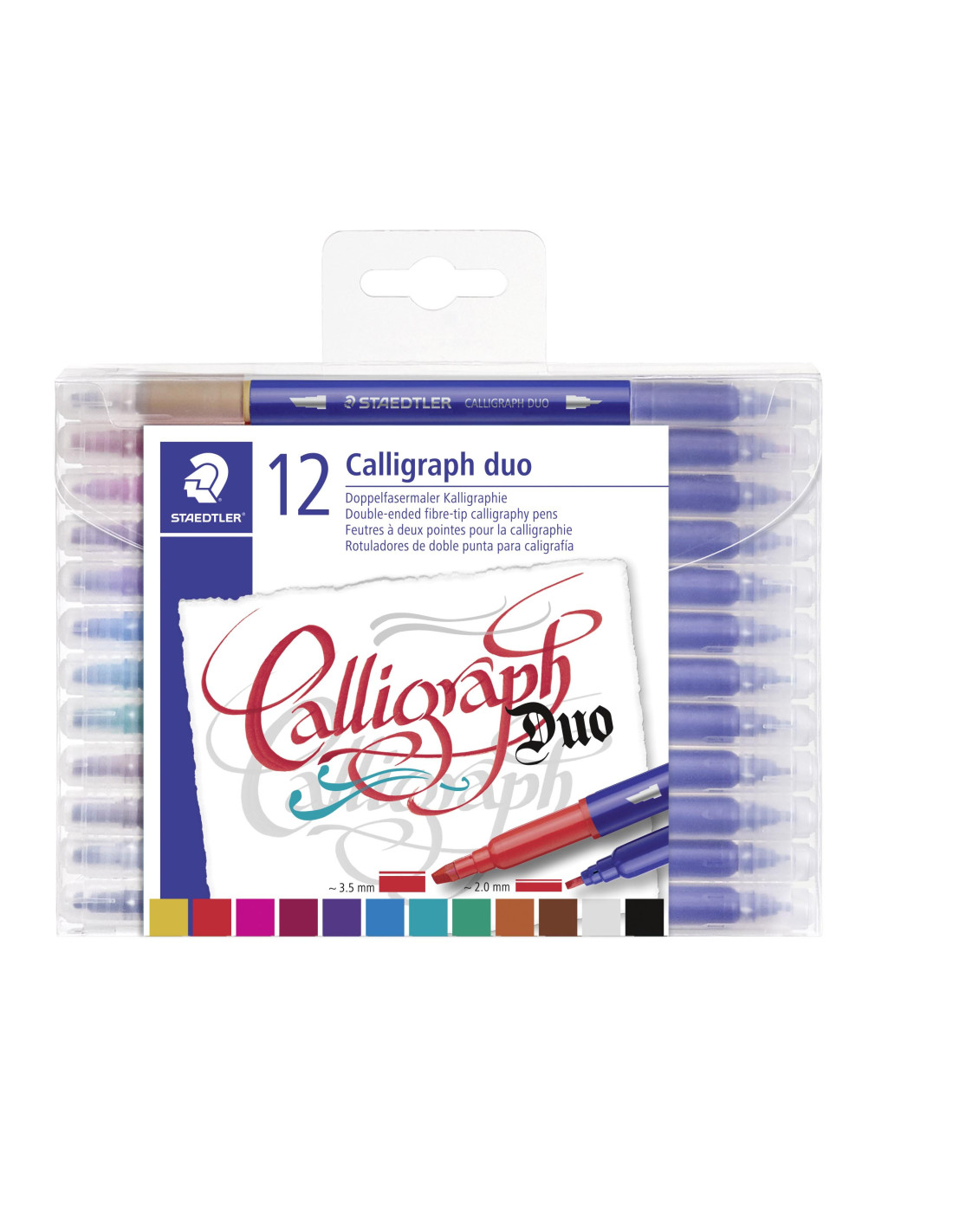 . Pennen har en 2 spidser; 2.0 mm og 3.5 mm. Sættet er til dem, der ønsker flotte effekter og et personligt præg på invitationer, kort eller breve. Pakningen kommer med 12 assorterede farver.