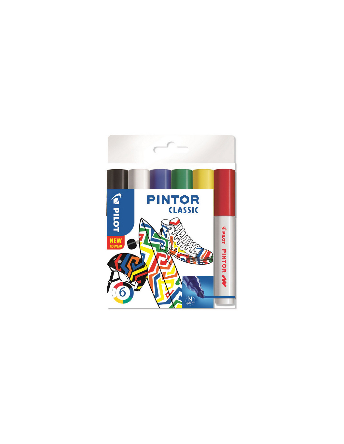 Vil du give dit tøj et nyt look, personliggøre et objekt eller dine møbler, eller dekorere porcelæn? Pilot Pintor gør alle dine ideer mulige, på alle materialer. Perfekt til tegning, farvelægning, dekoration, mærkning, skrivning, kalligrafi og meget mere. Fås i flere sjove farver og to spidsbredder: Fin (2,9 mm) og Medium (4,5 mm)Ultra-dækkende blækPigmentrig vandbaseret blækMulti-overfladeFarver som kan blandes og give uendelige nuancerFås i to spidsbredder (F og M)Blækket bliver permanent, hvis du stryger stoffetPakke med 6 assorteret farver: sort, blå, grøn, gul, orange og rød