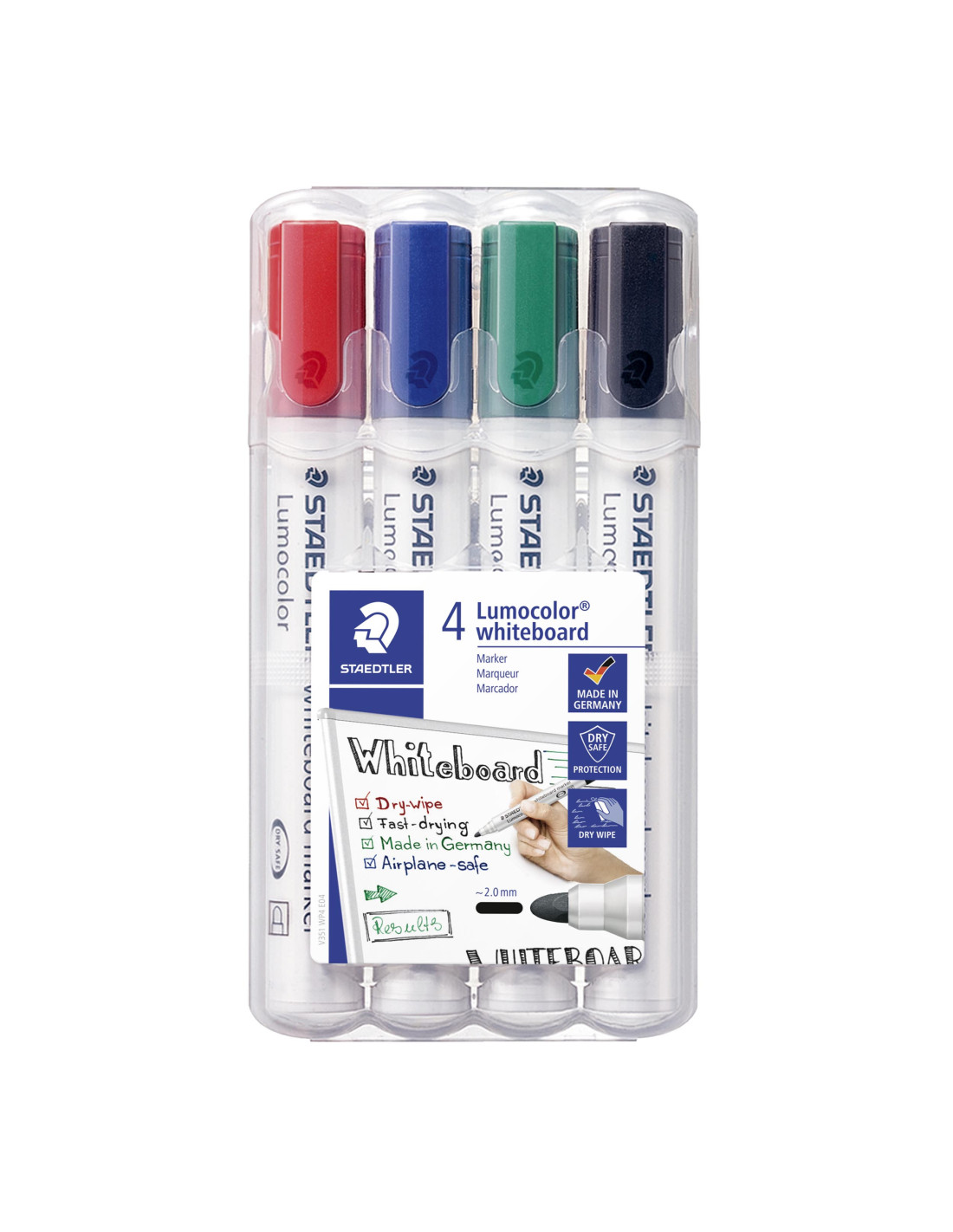 Indeholder DRY SAFE blæk, som gør den kan ligge uden hætte i op til 3 dage uden at tørre ind. Skaft og hætte i PP. Staedtler Stand-up boks. Ideel til foredragsholdere, skolen, kontoret og til møde- og konferencerummet. Xylen- og toluen fri blæk. Etui med 4 ass farver. Made in Germany