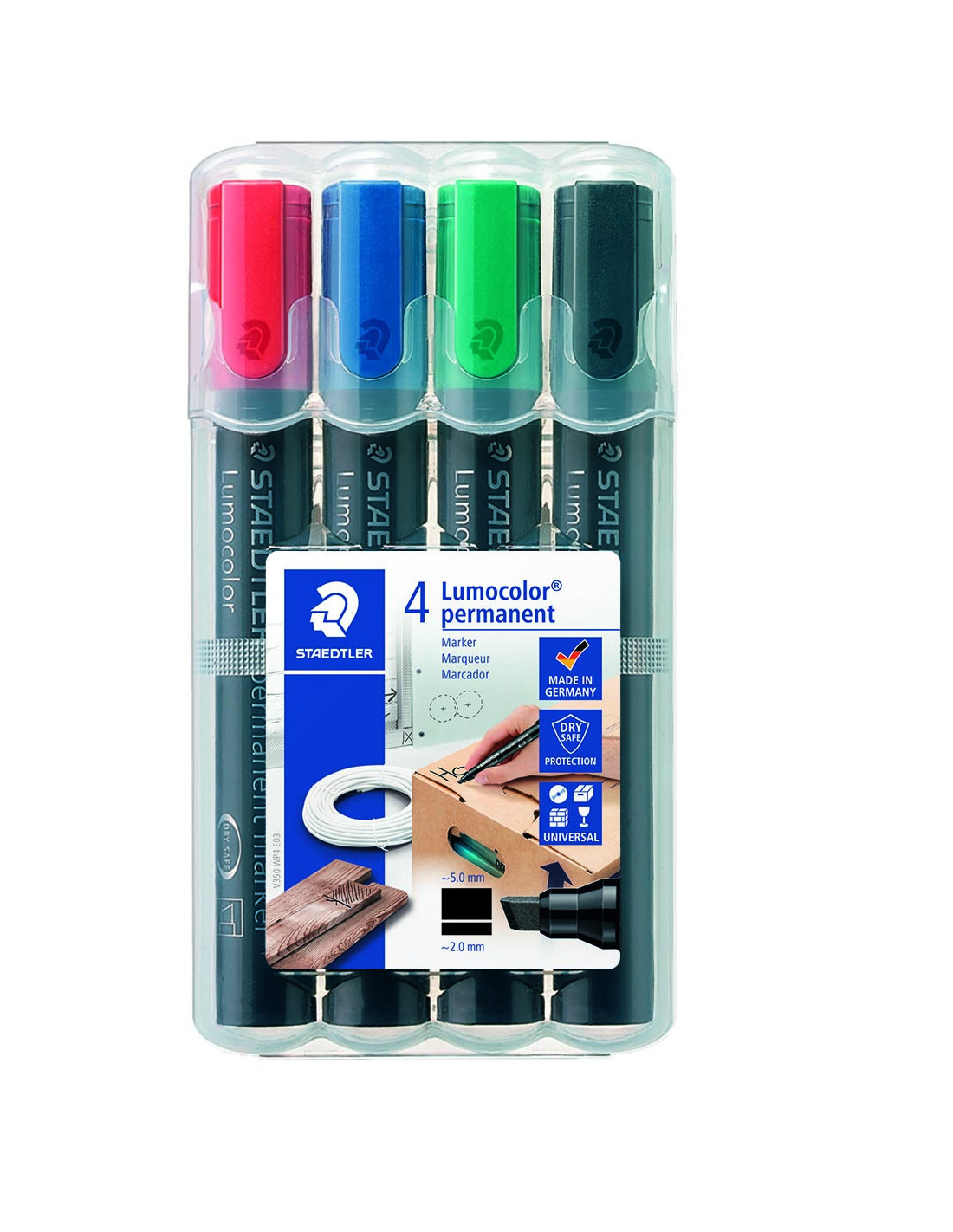 Skrå spids ca. 2-5mm. Smudsafvisende og vandfast og kan anvendes til mærkning og skrivning på stort set alle overflader så som metal, træ, plast, læder, karton. Tørrer på få sekunder, derfor ideel til venstrehåndede brugere. Farve intensiv, lav lugt, lysægte. Sort og grøn farve er samtidig vejrbestandige. Stand-Up Staedtler Box. PP skaft og hætte sikrer lang levetid. Indeholder DRY SAFE blæk som gør den kan ligge uden hætte i dagevis uden at tørre ind. Genopfyldelige. Indeholder 4 assorterede farver. Made in Germany