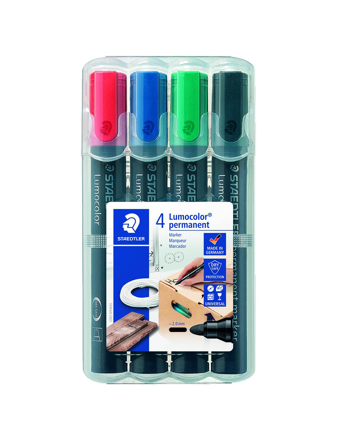 Rund spids ca. 2mm. Smudsafvisende og vandfast og kan anvendes til mærkning og skrivning på stort set alle overflader så som metal, træ, plast, læder, karton. Tørrer på få sekunder, derfor ideel til venstrehåndede brugere. Farve intensiv lav lugt. lysægte. Sort og grøn farve er samtidig vejrbestandige. Stand-Up Staedtler Box. PP skaft og hætte sikrer lang levetid. Indeholder DRY SAFE blæk som gør den kan ligge uden hætte i dagevis uden at tørre ind. Genopfyldelige. Indeholder 4 assorterede farver. Made in Germany