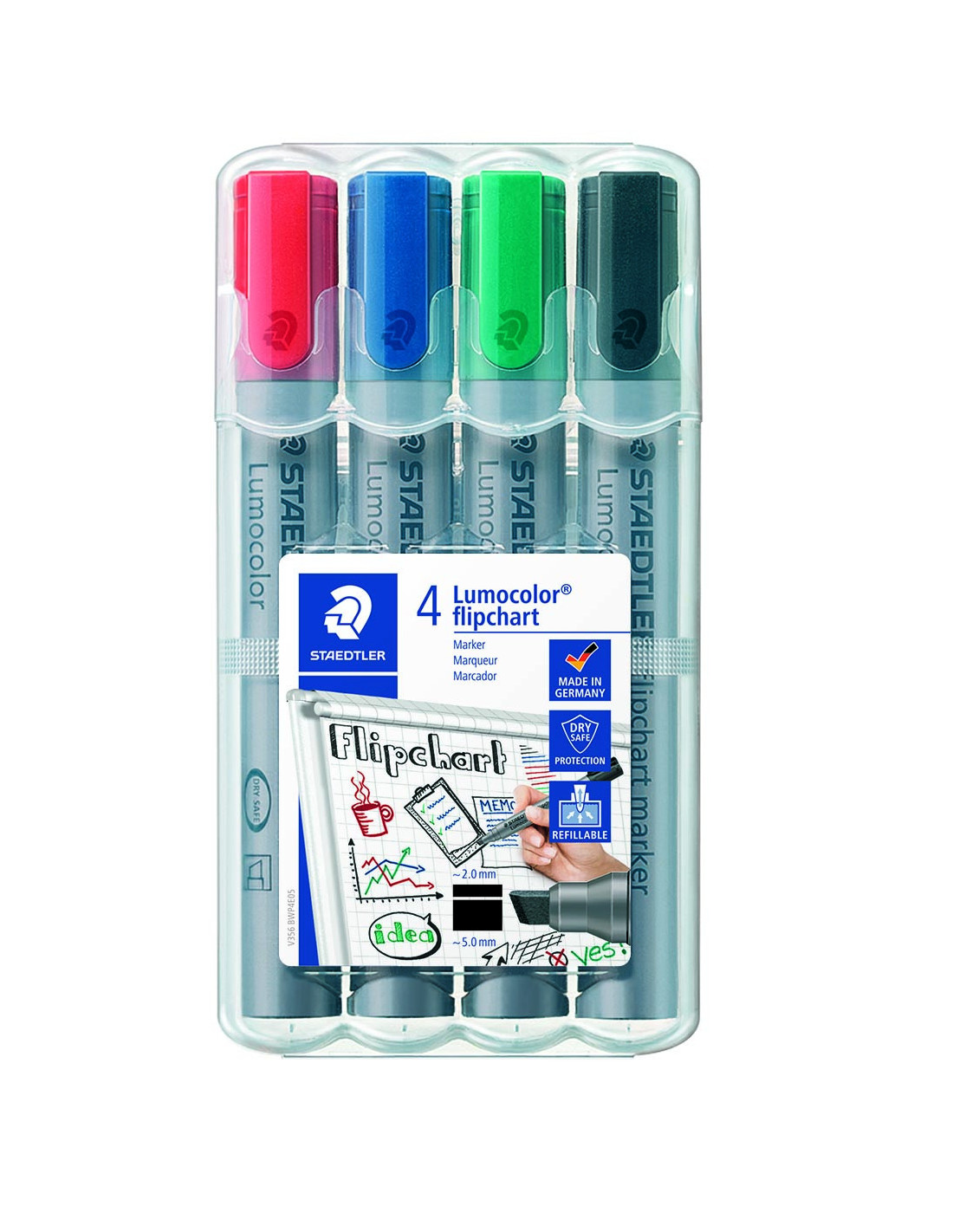 Ideel til brug på papir, vandbaseret tusch som ikke trænger igennem flipover papiret. Farve intensiv og lugtsvag. Tørrer på sekunder, derfor ideel til venstrehåndede brugere. Indeholder Dry Safe blæk som gør den kan ligge uden hætte i dagevis uden at tørre ind. Perfekt til mødelokalet. Stand-Up Staedtler Box. Xylen- og toluen fri blæk. Genopfyldelige. Indeholder 4 assorterede farver. Made in Germany