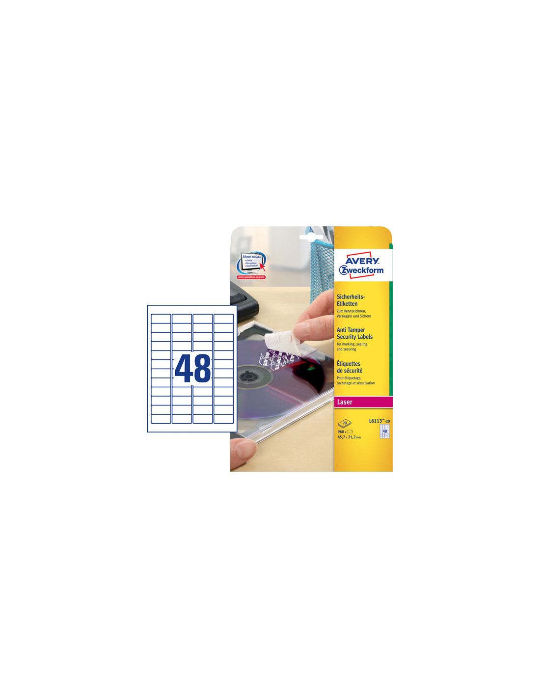 Avery Varenummer L6113-20Ekstra beskyttelse af dine ejendele. Et hvert forsøg på at fjerne etiketten efterlader et "Stop"-budskab, når etiketten fjernes. Velegnet til beskyttelse af PC'er, hårde hvidevarer og andre personlige ejendele. Klæber på såvel malet som umalet metal, glas og plastic.
