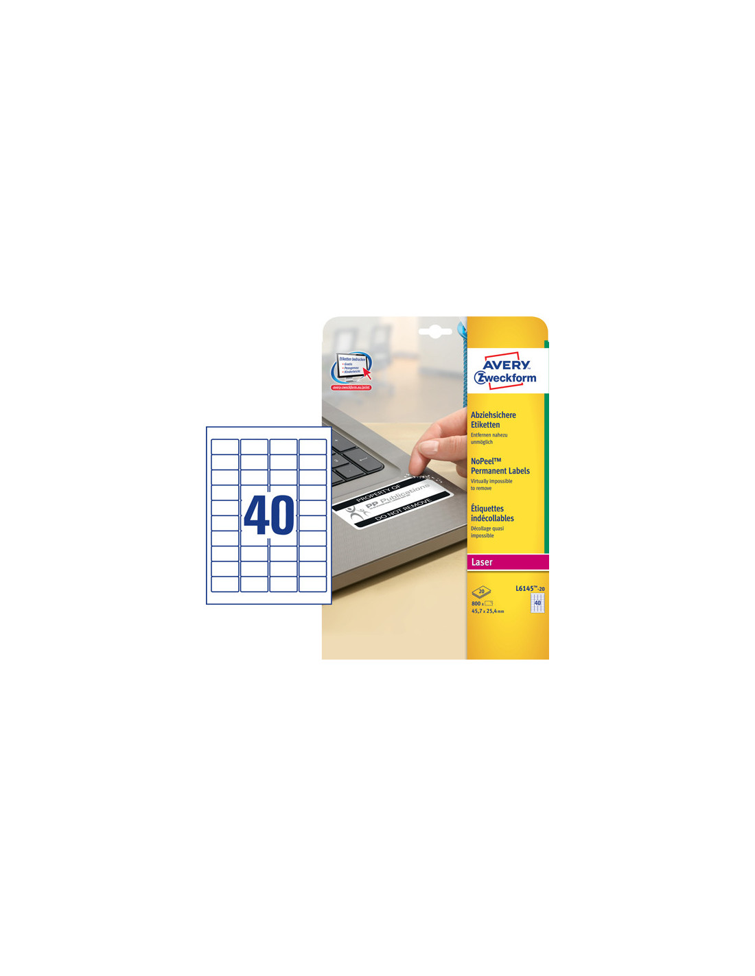 Avery Varenummer L6145-20Ekstra beskyttelse af dine ejendele. Smuldrer i små flager ved forsøg på fjernelse, og er derfor næsten umulige at fjerne. Ethvert forsøg på fjernelse af etiketten vil være åbenlyst. De er desuden modstandsdygtige overfor olie, smuds, vand og UV-stråler og tåler temperaturer fra -20 til +80 °C. De klæber på metal, glas, papir og plastik mm.