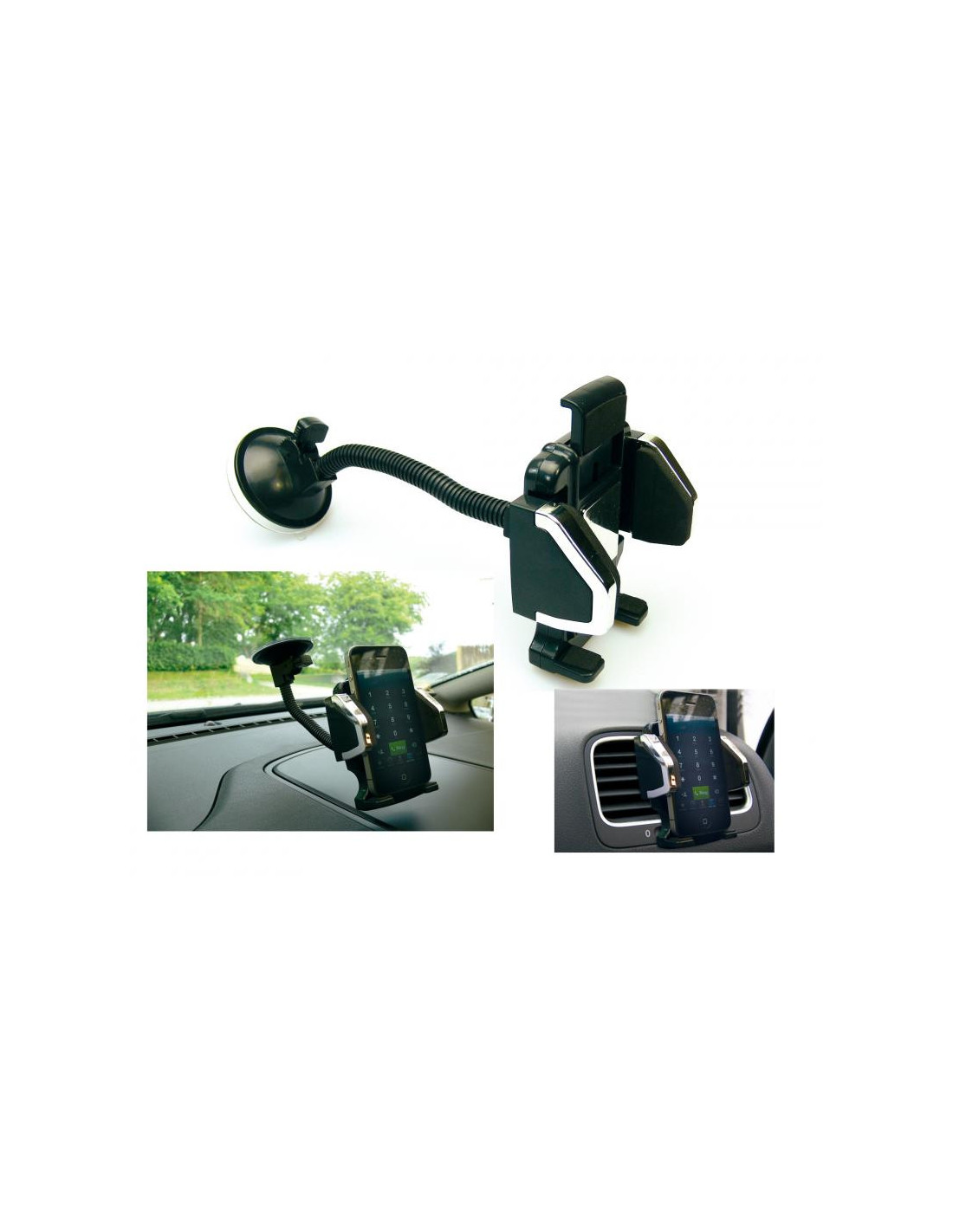 Fits most phones and covers. No need to remove the cover from the phone. Easy to install, no tools required. Adjustable frame ensures perfect fit. Quick release button and suction pad with lock knob. Rotatable 360 degrees. Extra large suction cup attaches firmly to the windscreen.