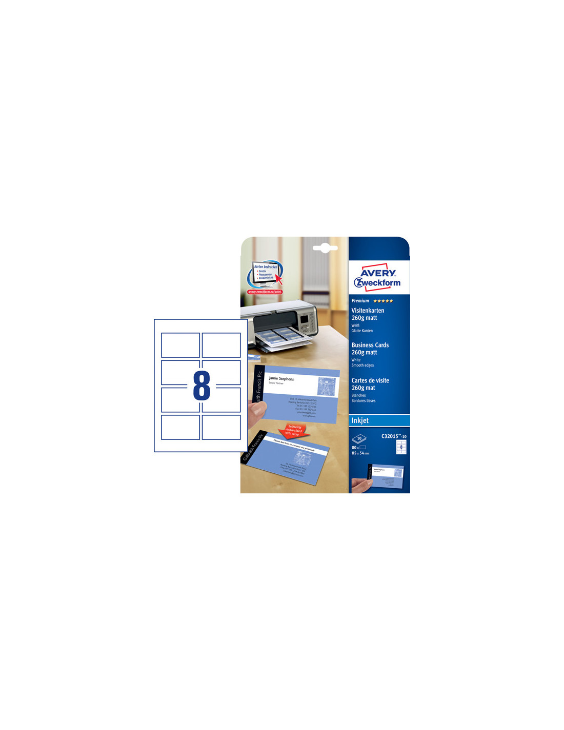 Avery Quick&Clean visitkort har helt skarpe kanter. Teknologien gør det samtidig nemt og hurtigt at adskille visitkortene.Teknologi: Quick&Clean Overflade: Mat Print på begge sider Print til kant Vægt: 260 g/m² 8 kort pr. ark På A4 ark Inkjet Farve: Hvid 85 x 54 mm Til: Visitkort 10 ark pr. pakke 80 kort pr. pakke