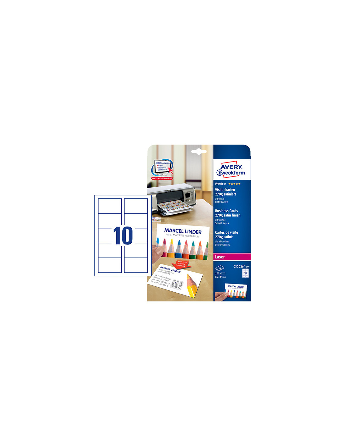Til Laserprinter Avery C32010-10 Visitkort universal, matt coated 185g ,str. 85x54 10 ark Avery Etiketter 89,00 DKK C32010-10 Læg i indkøbskurv