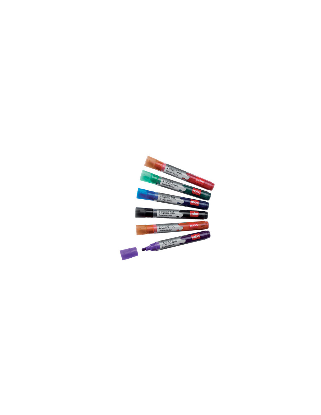 Bemærk indhold farver ! 2x rød, 2x blå, 1x sort, 1x grøn Klar og tydelig farve. Letflydende blæk til skrivning på flipovere, transparenter og whiteboardtavler Se-gennem beholder viser nøjagtigt, hvor meget blæk der er tilbage Kraftig markering, kan ses fra distancen Alkoholbaseret blæk, svag lugt, ikke giftige markere Pump to gange for at starte blæk gennemstrømning 3 mm kuglespidsNobo flydende blæk drywipe markere kan bruges på drywipe tavler, flipovere og transparenter. flydende blæk er letflydende og giver tydelige farver, der kan ses på afstand. Beholdervindue viser blækniveau og pump-action tippen primer fritflydende blæk til øjeblikkelig brug. Standard 3 mm kuglespids. Assorterede farver: 2x rød, 2x blå, 1x sort, 1x grøn. Pakkestørrelse: 6.