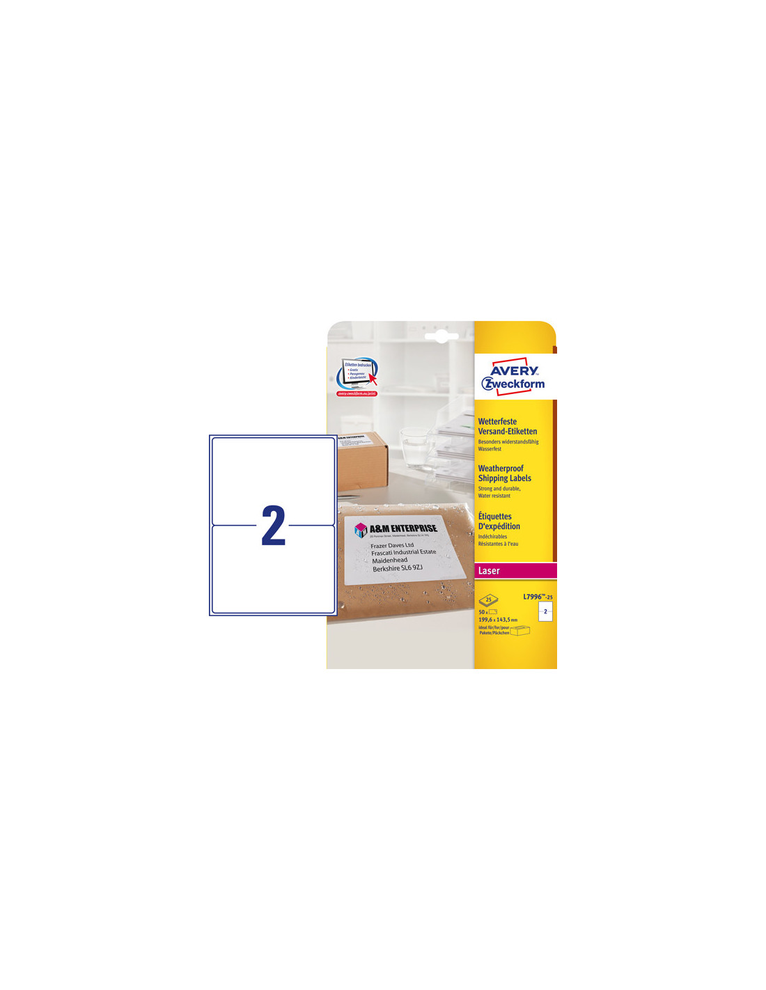 Avery Varenummer L7996-25Stærk og holdbar polyester etiket, som kan modstå ekstrem behandling. Teksten på etiketten vil altid være læsbar. Modstandsdygtig overfor olie, smuds, vand og UV-stråler. Velegnet til alle emballager inklusiv polythene og Tyvek breve.