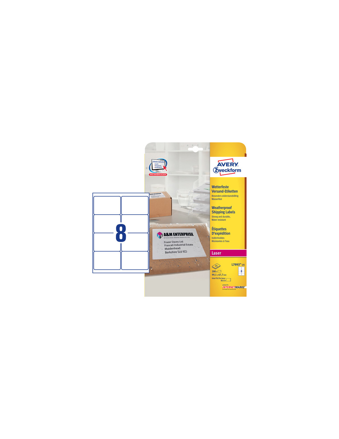 Avery Varenummer L7993-25Stærk og holdbar polyester etiket, som kan modstå ekstrem behandling. Teksten på etiketten vil altid være læsbar. Modstandsdygtig overfor olie, smuds, vand og UV-stråler. Velegnet til alle emballager inklusiv polythene og Tyvek breve.
