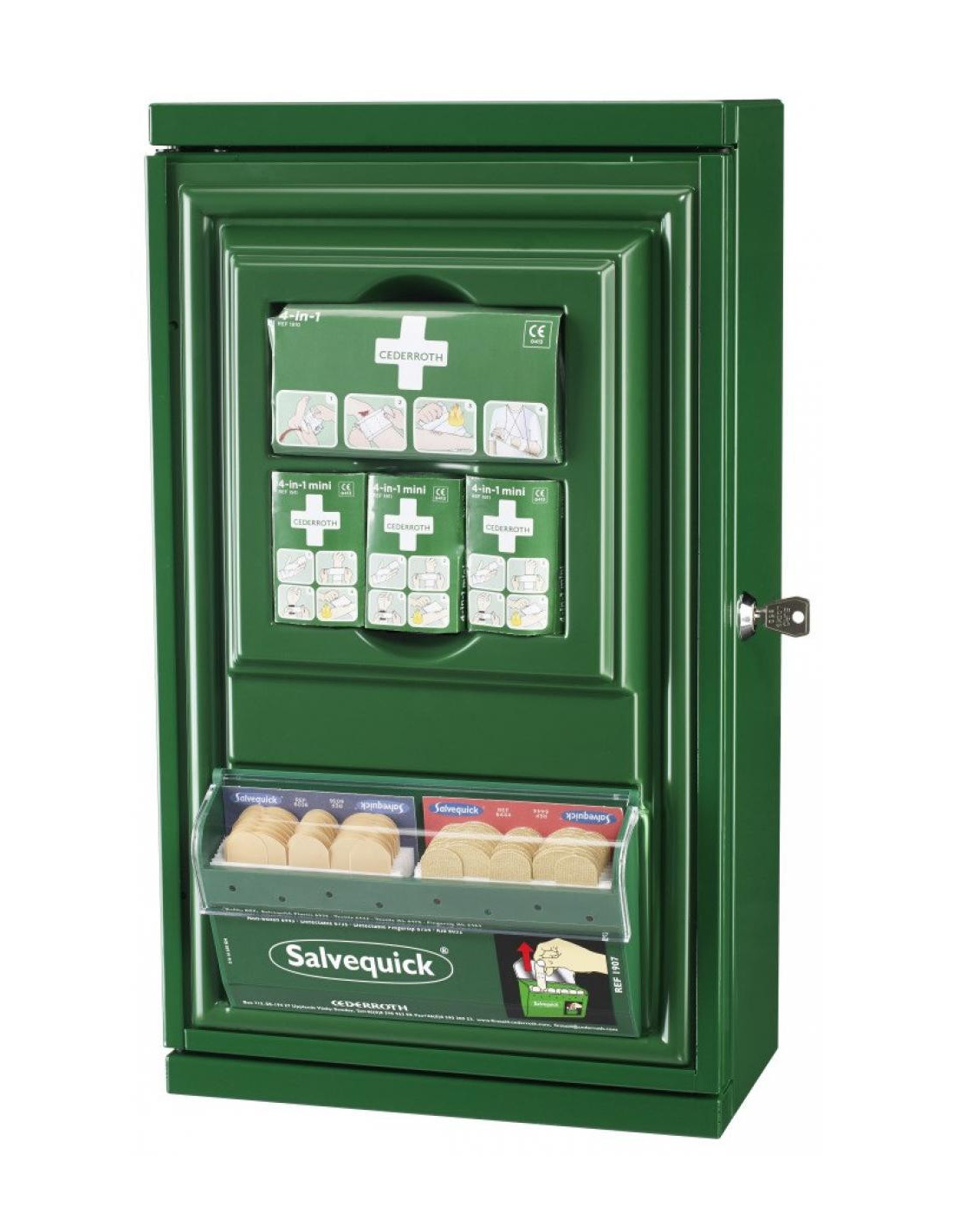 Låsbart skab i metal med en lille førstehjælpstavle monteret på forsiden