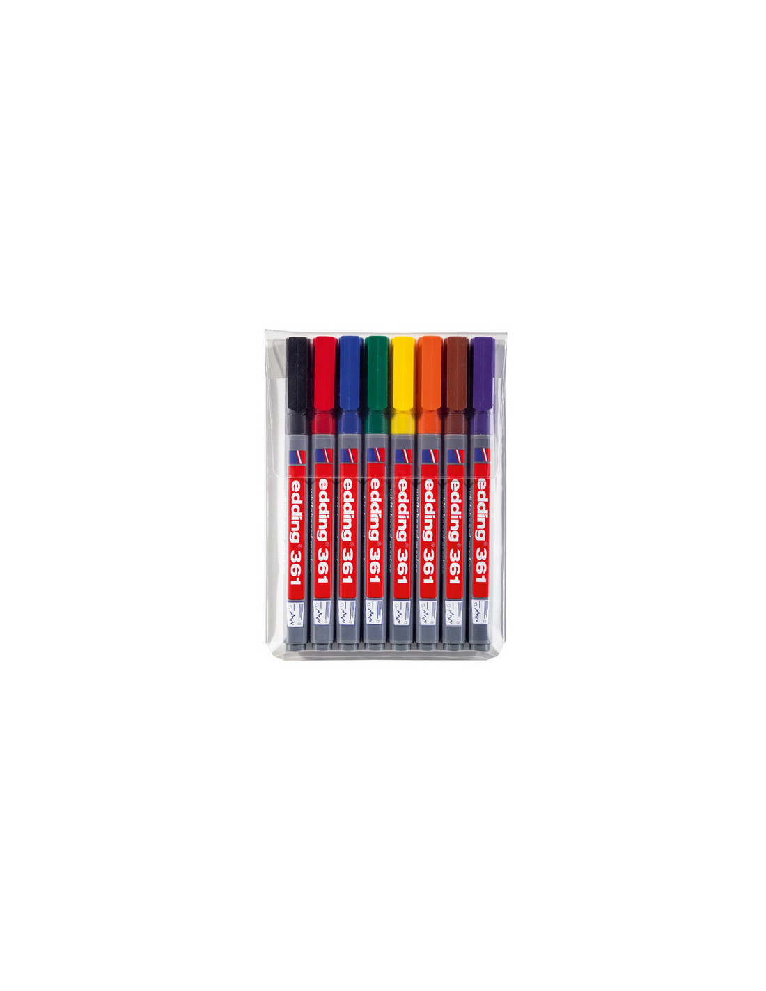 Whiteboard marker sæt med 8 penne i farverne: Sort, rød, blå og grønWhiteboard marker med rund spids.Hurtigtørrende pigmentblækMed "cap off" blæk, hvilket betyder at whiteboard markeren kan ligge i kortere tid uden hætte og alligevel være skriveklar.PlastikhylsterSkrivebredde 1mmVarenummer: 361-8