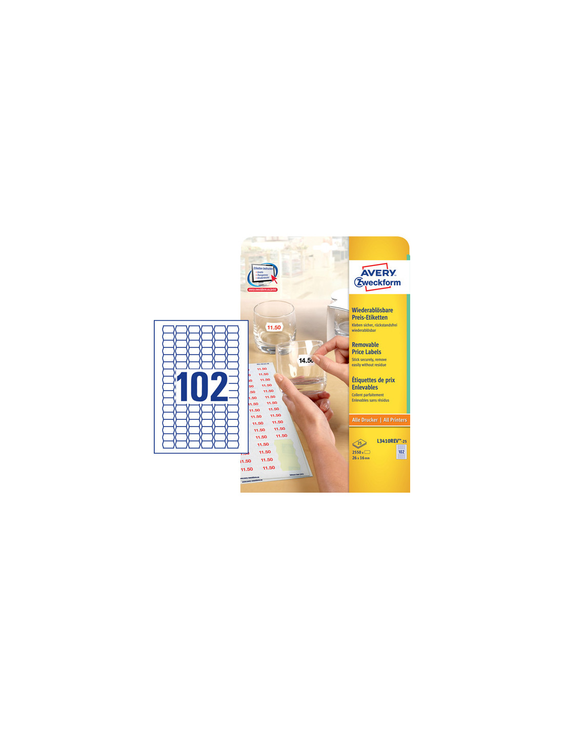 Avery L3410REV-25 Prisetiketter, hvide, 26 x 16 mm, aftagelige 25ark, 102 pr. ark