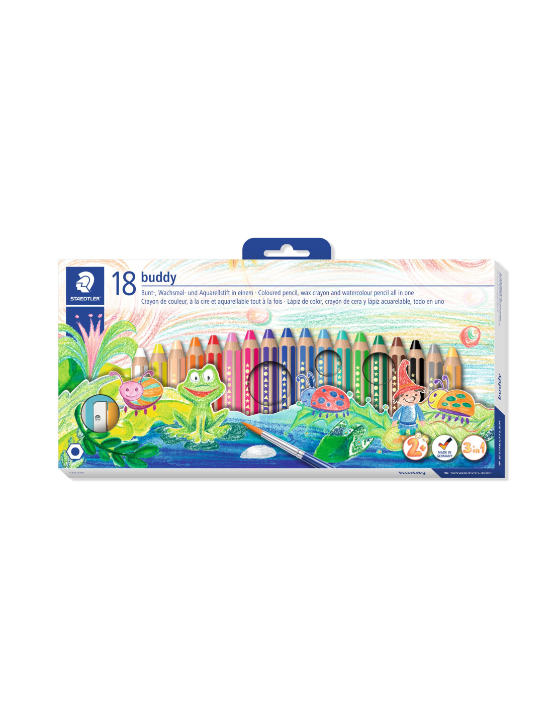 Buddy farveblyanten har et attraktivt stjernedesign og formen er designet specielt til små børnehænder og til ikke at trille ned af bordet. Buddy kan bruges på papir, pap, glas og mørke overflader, og den er ideel til de første skrive og tegne oplevelser. Farveblyanten har en forstærket blyantsmine. Den er fremstillet af PEFC certificeret træ. Leveres i papetui med 18 stk. i assorterede farver, inkl. guld og sølv samt 1 stk sikker blyantspidser og 1 stk pensel, hvis man ønsker at bruge farverne sammen med vand. Til børn fra 2 år.