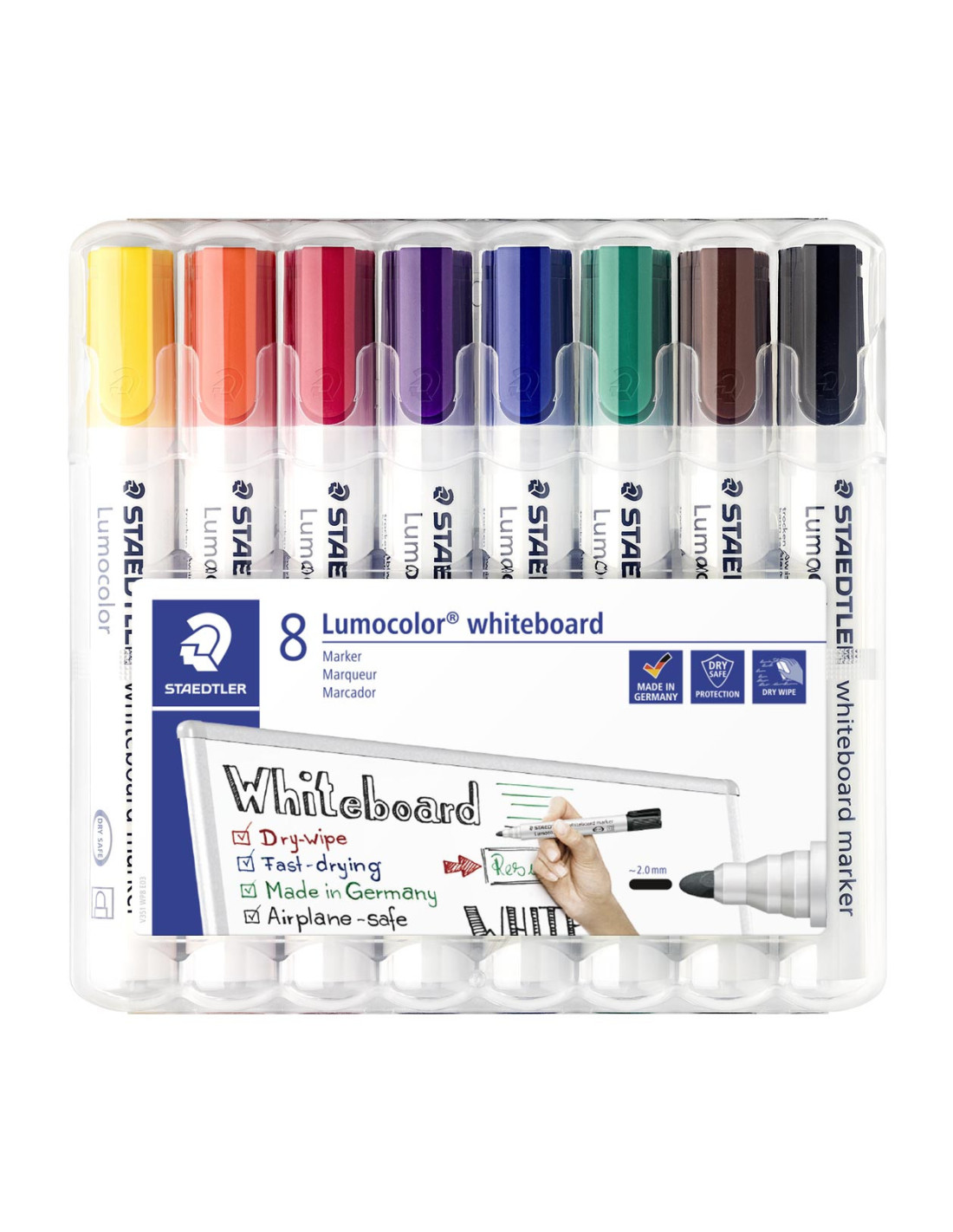 Indeholder DRY SAFE blæk, som gør den kan ligge uden hætte i op til 3 dage uden at tørre ind. Skaft og hætte i PP. Staedtler Stand-up boks. Ideel til foredragsholdere, skolen, kontoret og til møde- og konferencerummet. Xylen- og toluen fri blæk. Etui med 8 ass farver. Made in Germany