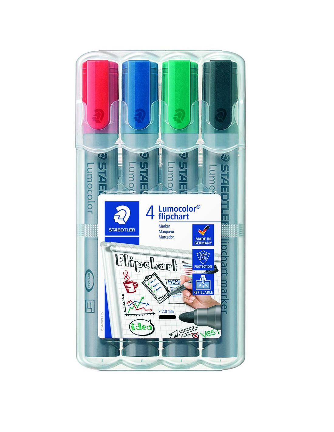 2MM. Ideel til brug på papir, vandbaseret tusch som ikke trænger igennem flipover papiret. Farve intensiv og lugtsvag. Tørrer på sekunder, derfor ideel til venstrehåndede brugere. Indeholder Dry Safe blæk som gør den kan ligge uden hætte i dagevis uden at tørre ind. perfekt til mødelokalet. Stand-Up Staedtler Box. Xylen- og toluen fri blæk. Genopfyldelige. Indeholder 4 assorterede farver. Made in Germany