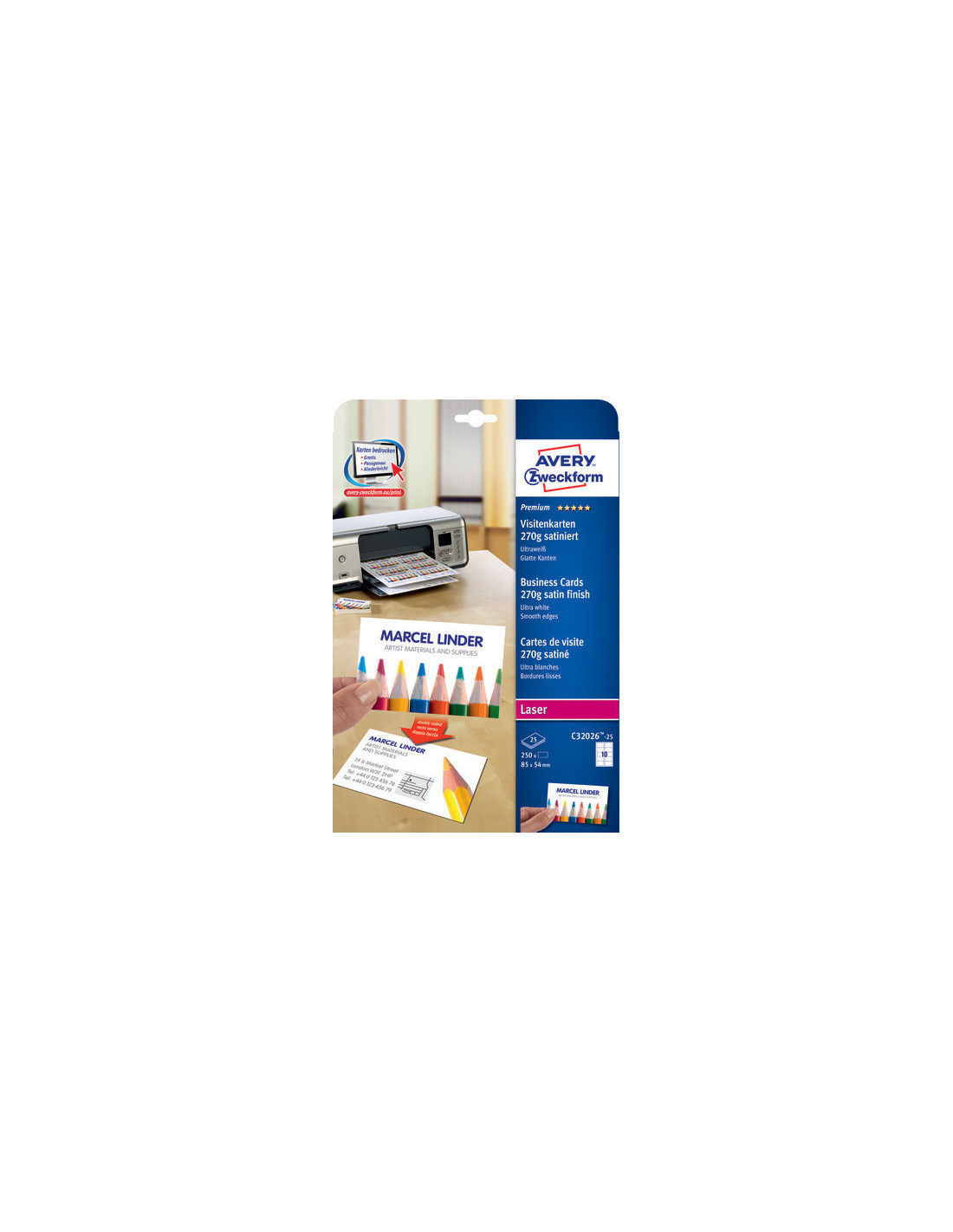 Avery Quick&Clean visitkort har helt skarpe kanter. Teknologien gør det samtidig nemt og hurtigt at adskille visitkortene.Teknologi: Quick&Clean Overflade: Satin Print på begge sider Til: Visitkort 25 ark pr. pakke 250 kort pr. pakke Anbefalet til: Farvelaser / Laser Farve: Hvid 85 x 54 mm Vægt: 270 g/m² 10 kort pr. ark På A4 ark