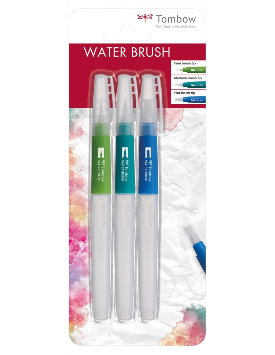 Ved at klemme pennens krop reguleres vandstrømmen. Vandpenslen har en beskyttende hætte. Ideel til brug sammen med Tombow ABT Dual Brush penne eller andre akvarelprodukter. Velegnet til akvareller, bogstaver, illustrationer, urban skitsering, manga og meget mere. Nem at genopfylde. Spidsen kan nemt rengøres med vand. Blisterpakning med tre penne: en med fin spids, en med medium spids og en med fladt spids.